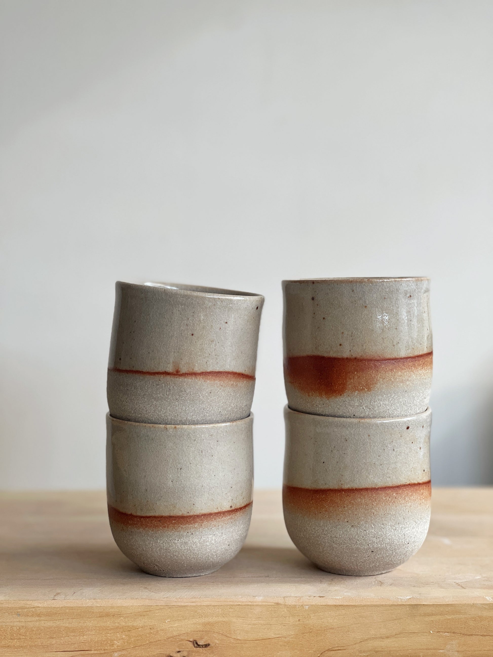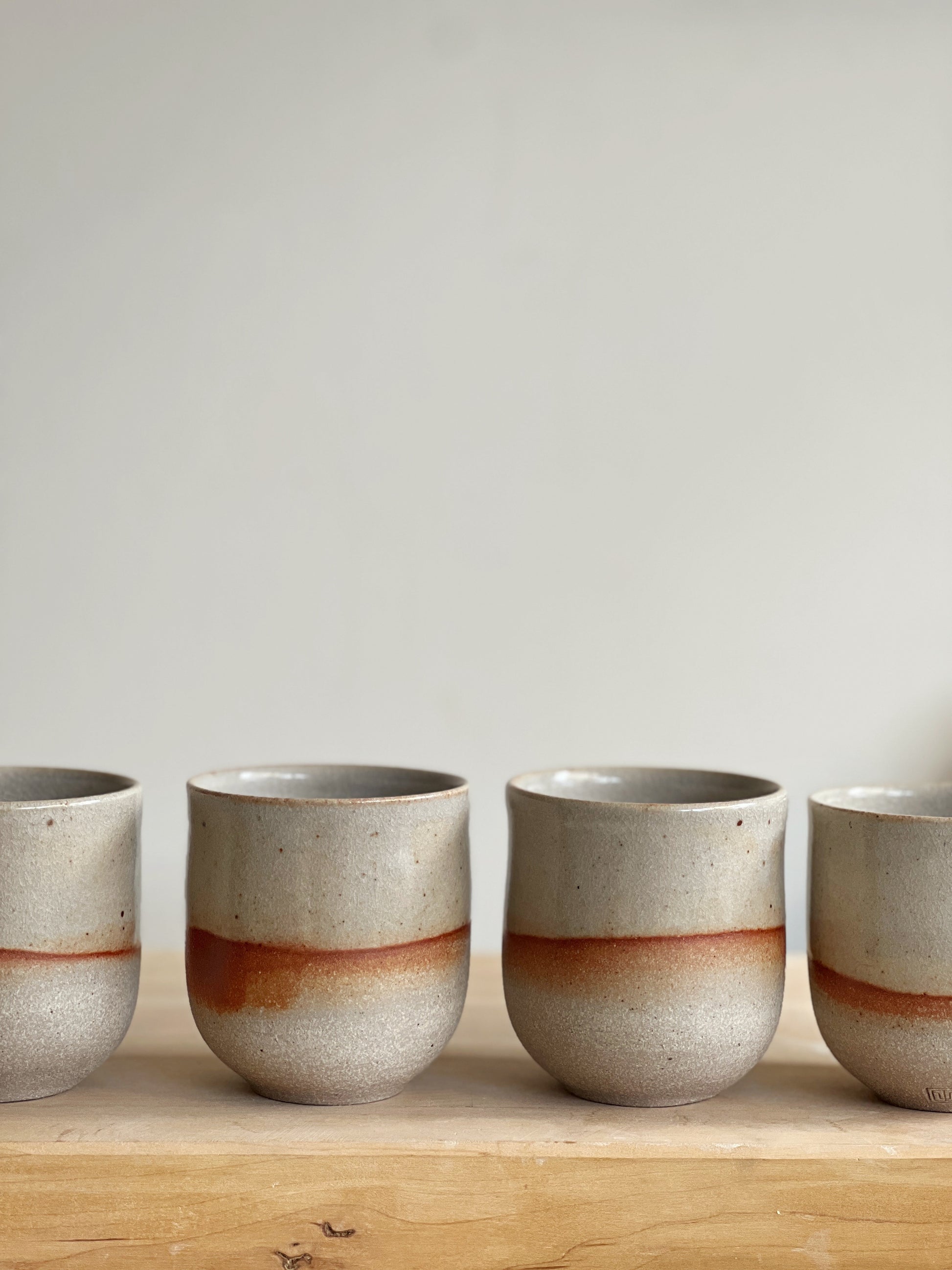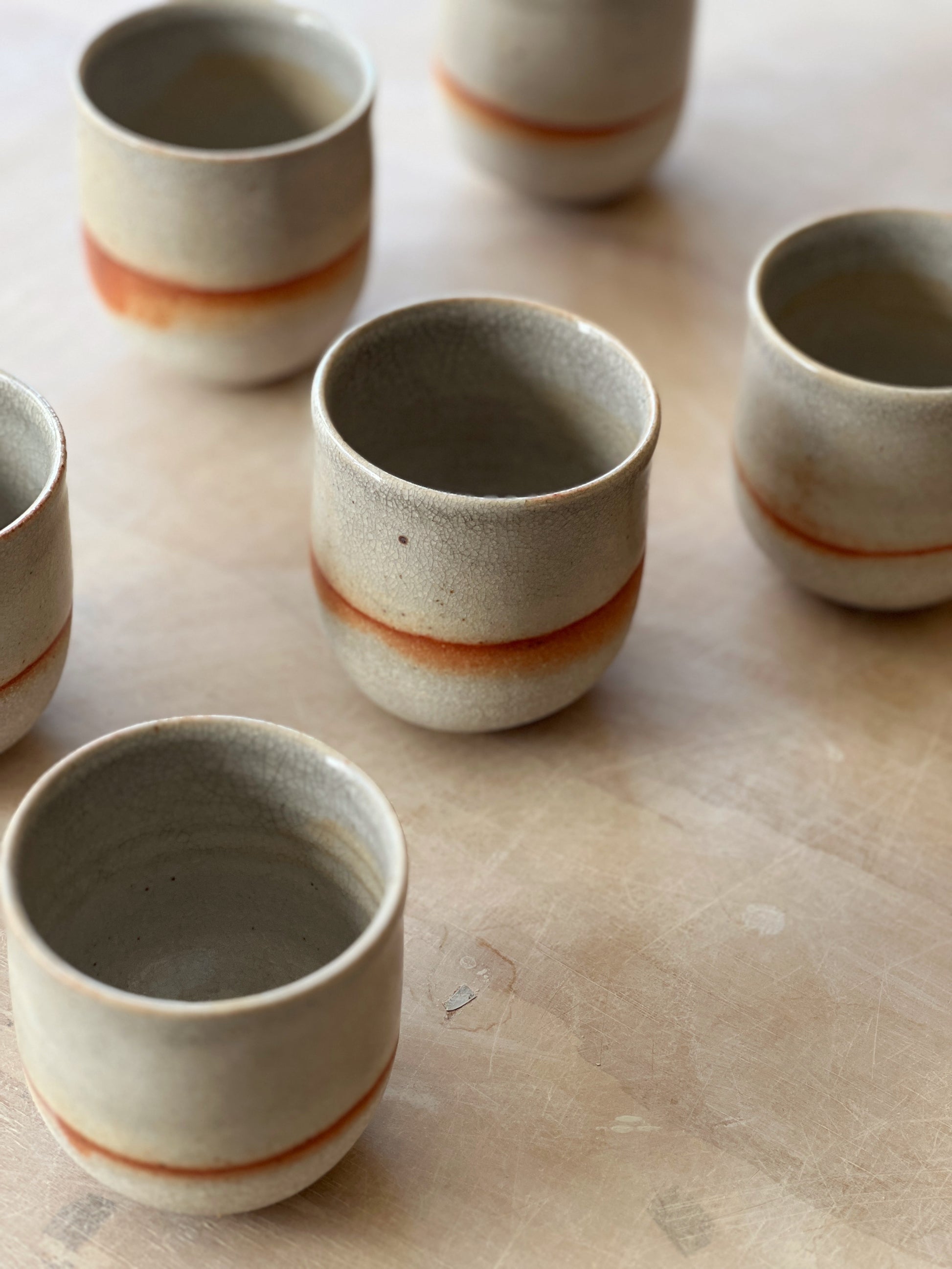 Tumbler (or handle-less mug) in crackle finish. The unique properties of this glaze creates this red horizon-like effect where it hits the clay.
