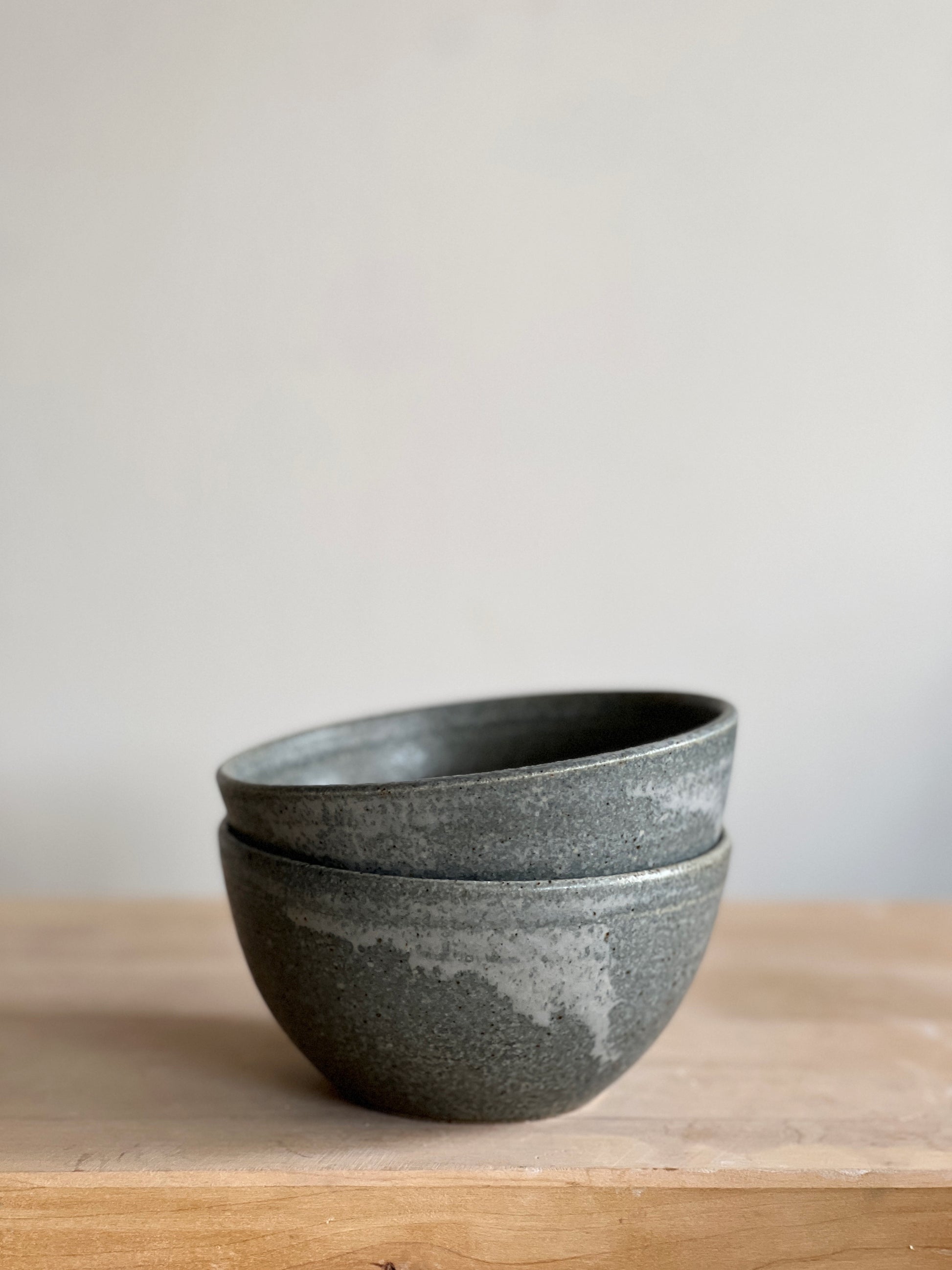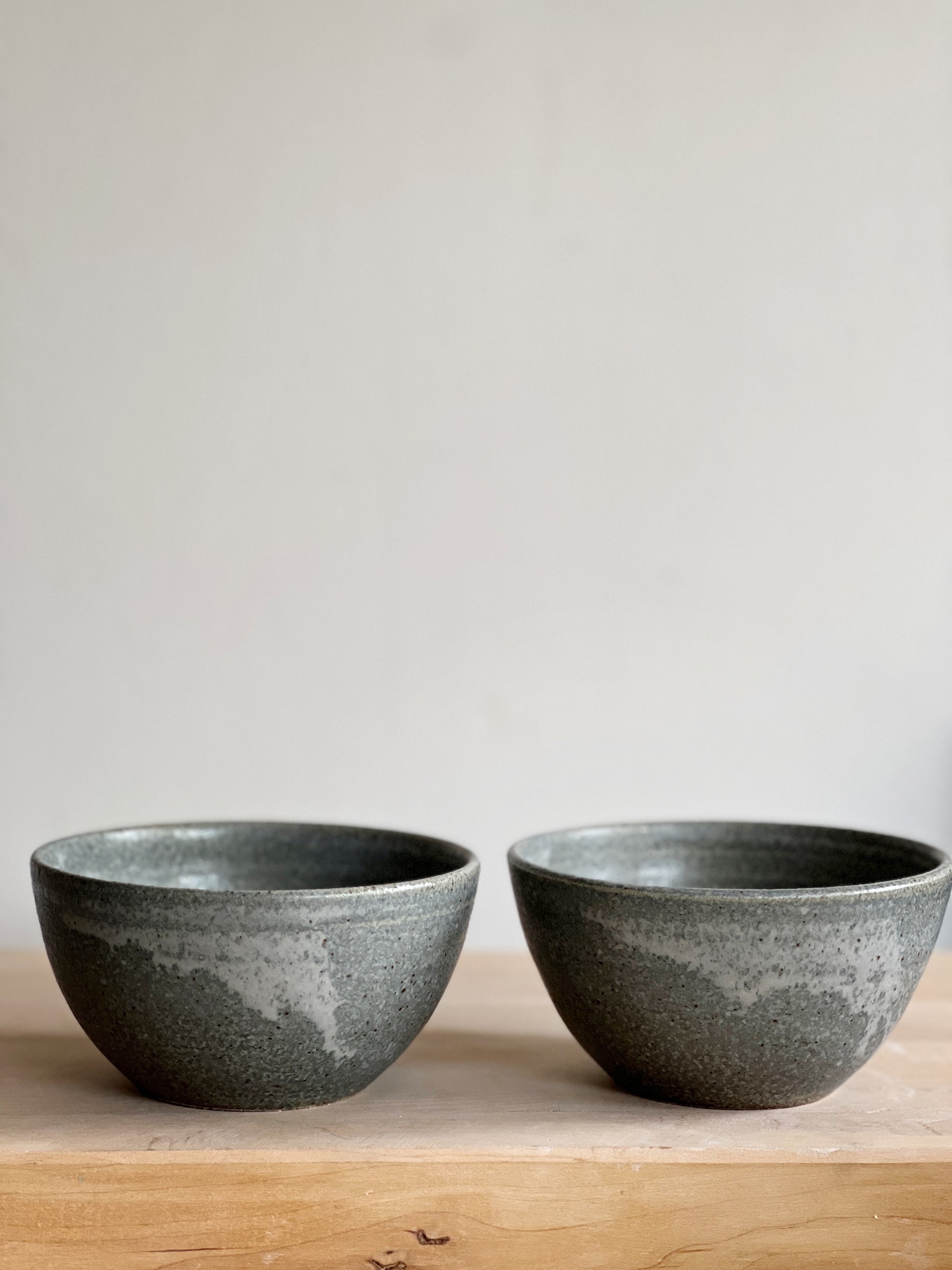 Breakfast bowl in speckly blue gray glaze. A versatile size and shape suitable for cereal, yogurt, salad and soup. The pearly pink variation in color appears where the glaze is thickest.